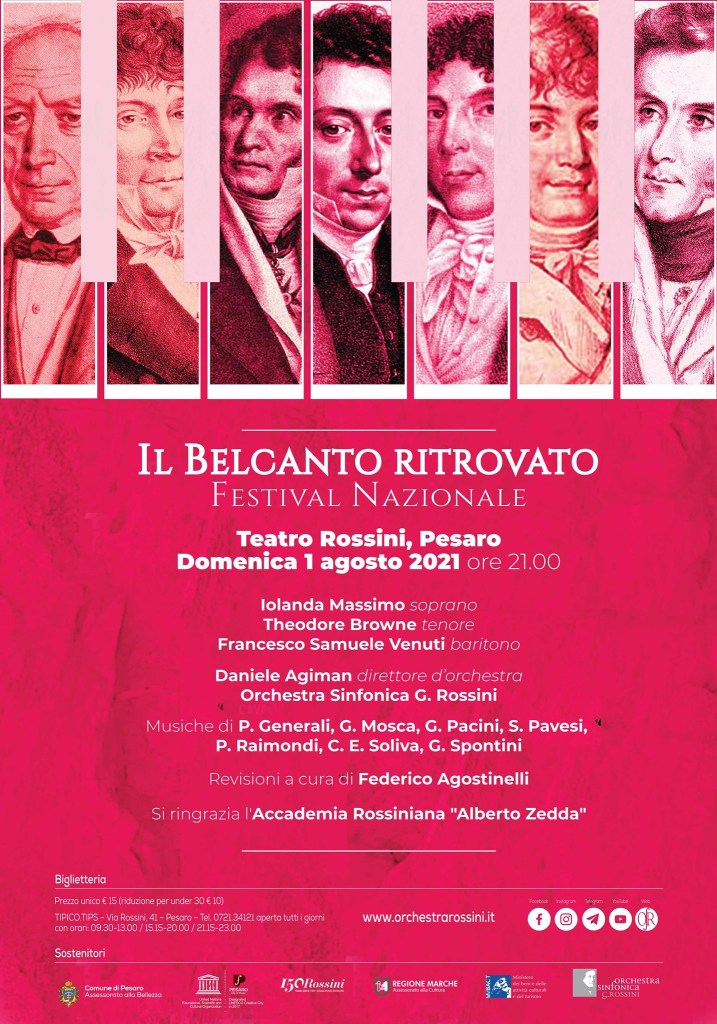 Grazie a questa straordinaria disponibilità di competenze artistiche ed organizzative, è nata così l’idea di dar vita ad un Festival lirico. Si è scelto il titolo “Il Belcanto ritrovato” e la realizzazione della I edizione sarà nell’estate 2022 a Pesaro, città Unesco della Musica. Con questo Festival si intende recuperare e fare conoscere in Italia e all’estero autori italiani di quel periodo attraverso rappresentazioni operistiche, concerti, conferenze e convegni musicologici.