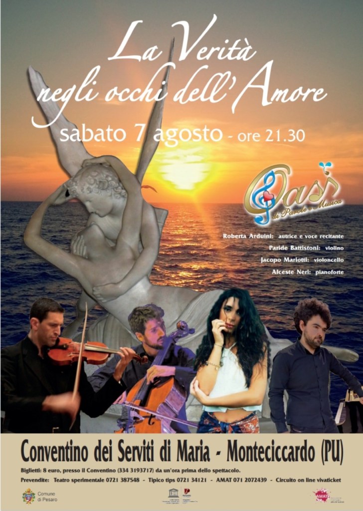 Sabato 7 agosto al Chiostro del Conventino di Monteciccardo – nell’ambito di Conventinote prima rassegna promossa dal Comune di Pesaro con l’AMAT – appuntamento con La verità negli occhi dell’amore, coinvolgente spettacolo di parole e musica in prima assoluta di Roberta Arduini con Oasi: Roberta Arduini (autrice e voce recitante), Paride Battistoni (violino), Jacopo Mariotti (violoncello) e Alceste Neri (pianoforte).