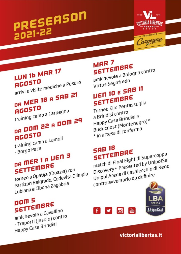 La Carpegna Prosciutto Basket Pesaro comunica il programma precampionato della stagione 2021/2022: