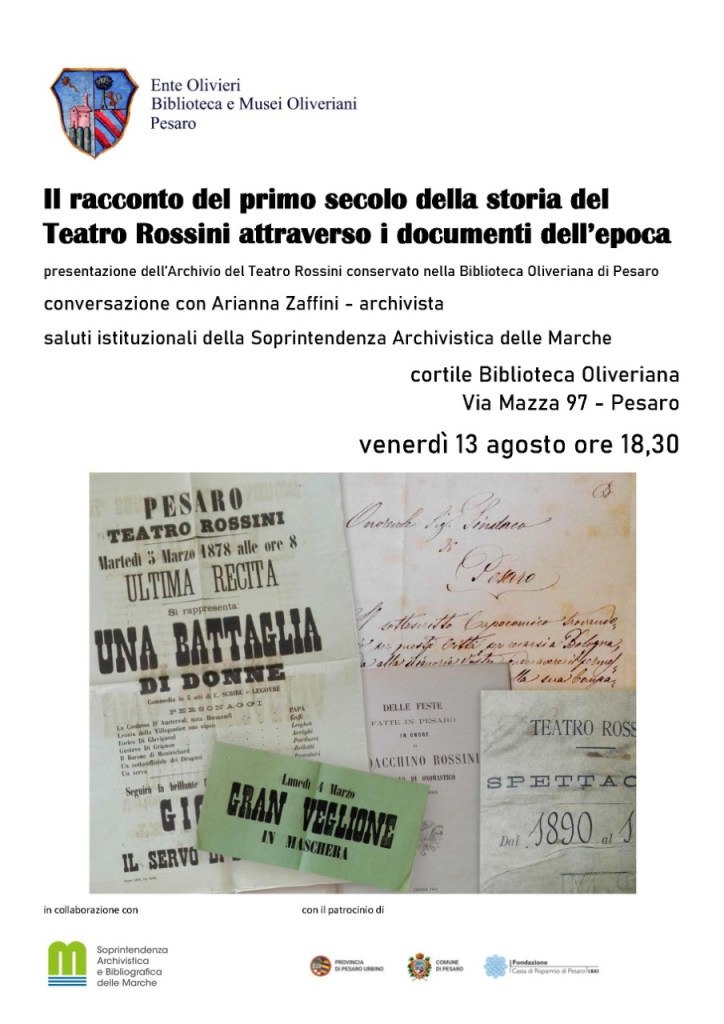 In occasione dell’edizione 2021 del Rossini Opera Festival, Venerdì 13 Agosto alle ore 18,30, verrà ospitata, presso il cortile della Biblioteca Oliveriana, una conferenza illustrativa della prestigiosa collaborazione tra la Biblioteca Oliveriana e la Soprintendenza Archivistica delle Marche, che ha reso possibile l’ordinamento e l’inventariazione dell’Archivio Storico Comunale di Pesaro.