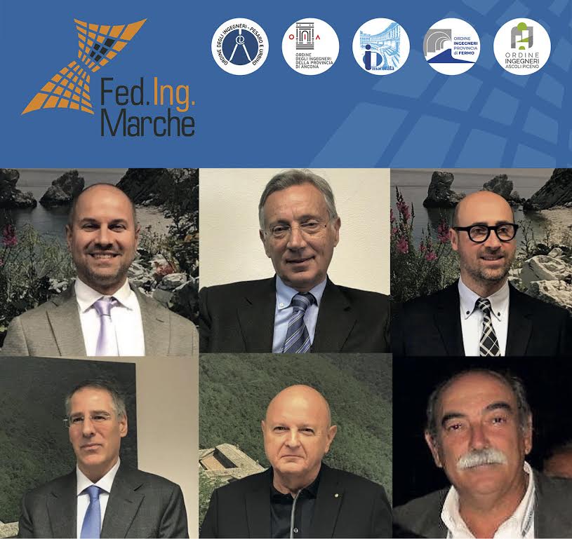 | Il presidente di Feding Marche Conti e i presidenti degli ordini degli ingegneri delle cinque province marchigiane Fazi, Romagnoli, Paulini, Babini e Zamponi |