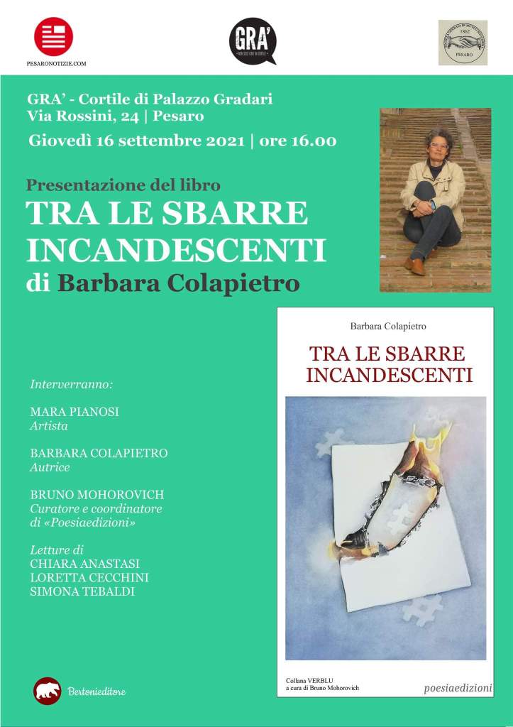 Giovedì 16 Settembre alle ore 16.00 appuntamento con Barbara Colapietro che presenterà la sua ultima fatica letteraria “Tra le sbarre incandescenti”, una silloge poetica pubblicata da Bertoni Editore di Perugia.