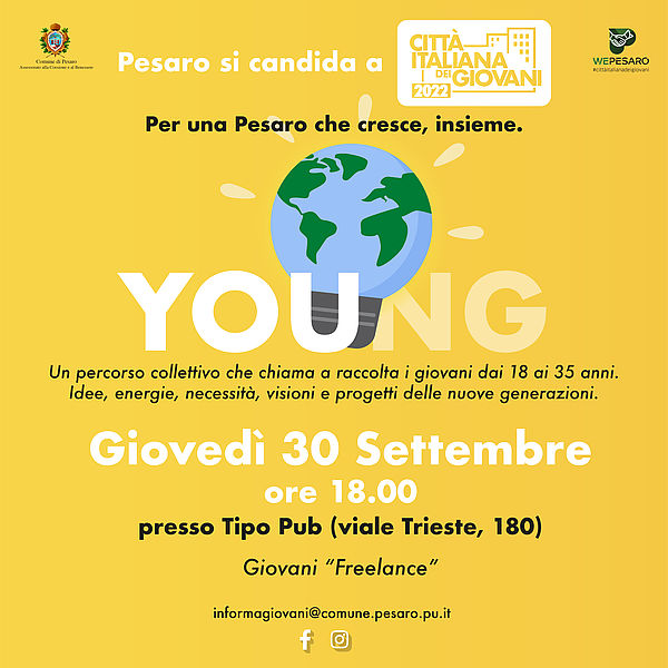Altra tappa per il percorso di candidatura di Pesaro a “Città italiana dei Giovani 2022” che domani, giovedì 30 settembre, alle ore 18, al Tipo Pub di viale Trieste, dà appuntamento ai giovani “free lance”. «Sarà una serata conviviale in cui confrontarsi, in libertà, sui sogni, progetti, bisogni dei ragazzi che vivono nel territorio – Mila Della Dora, assessora alla Coesione e al Benessere -. Coinvolgeremo anche i ragazzi dai 18 ai 35 anni che, fino ad oggi, non ha preso parte ad eventi istituzionali e coloro che non sono iscritti a categorie ed associazioni, per raccogliere il più ampio ventaglio di proposte».