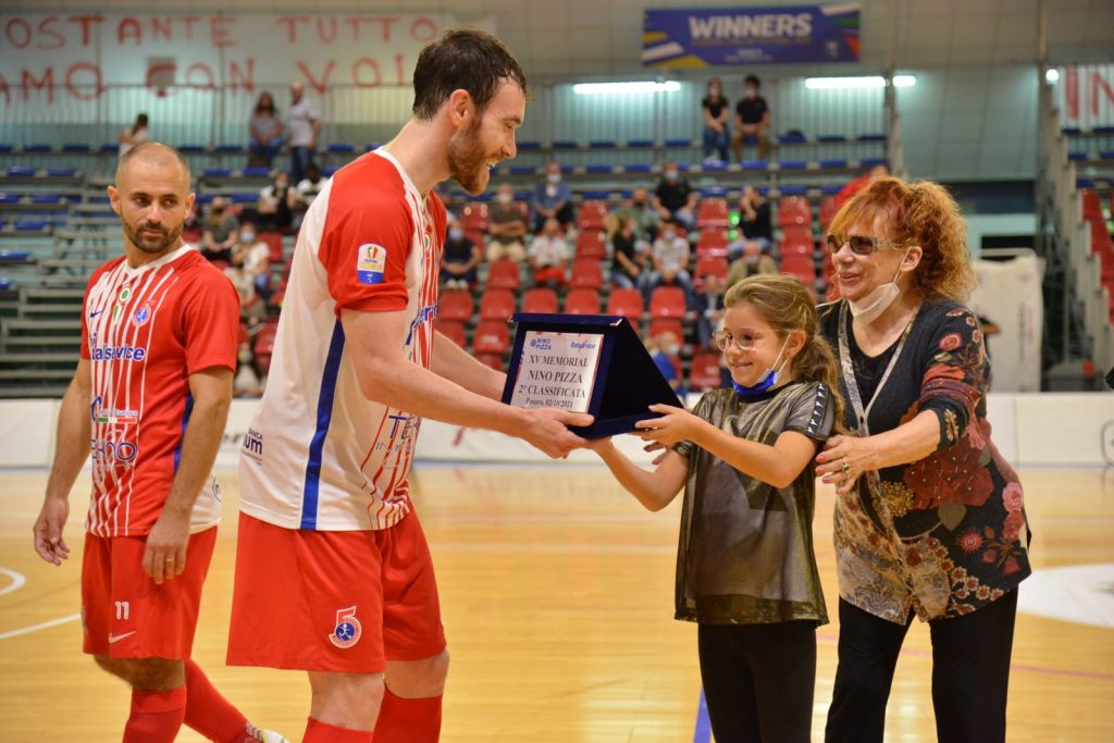 Italservice Pesaro priva degli argentini Bolo, Borruto, Cuzzolino e Taborda, impegnati in finale ai mondiali di calcio a 5 in Lituania (domani, ore 19, sfideranno il Portogallo). A passare in vantaggio sono gli ospiti con Jonas, colpo di mercato estivo dei piemontesi. La replica non si fa attendere troppo ed è Salas a impattare un paio di minuti dopo. Il risultato non si sblocca più, nonostante i tentativi dei biancorossi di beffare P. Siqueira. Finisce in parità. La gara dal dischetto premia i piemontesi, che alzano la coppa in onore del presidente Nino Pizza, omaggiato da un lungo e sentito applauso del pubblico. A premiare vincitori e vinti, il presidente Lorenzo Pizza, la sorella Marilù e la mamma Daniela, oltre alla piccola Ludovica.