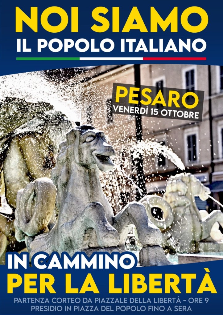 Invitiamo tutti gli italiani liberi appartenenti ad ogni categoria, studenti, lavoratori, imprenditori,sanitari, trasportatori, forze dell’ordine, ad aderire allo sciopero che partirà venerdì 15 ottobre ed a manifestare con noi a Pesaro per la libertà e il ripristino immediato dello stato di diritto.
