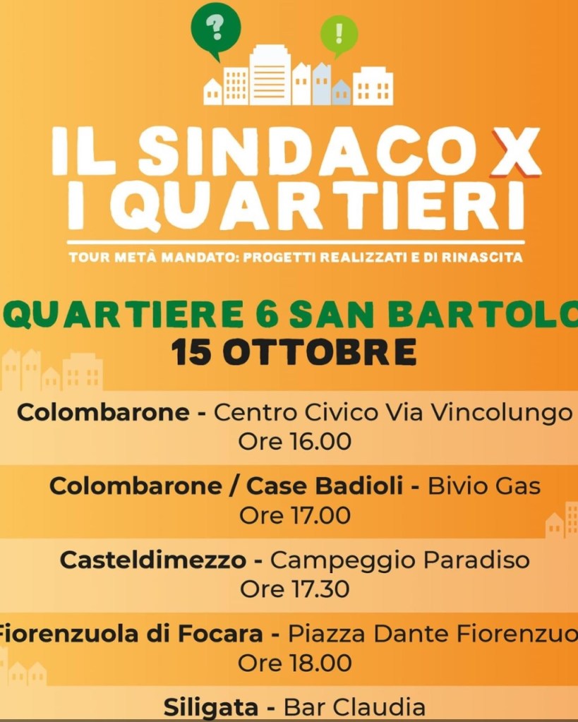 Partito lo scorso 15 ottobre dal Q6, San Bartolo, il tour del sindaco toccherà, tra il mese di ottobre e novembre, i 12 Quartieri (Centro, Cinque Torri – Santa Veneranda, Colline e Castelli, Villa Fastiggi-Villa Ceccolini, Cattabirghe-Vismara, San Bartolo, Montegranaro-Muraglia, Pozzo alto-Borgo Santa Maria, Soria-Tombaccia, Villa San Martino, Porto-Mare, Pantano) e il Municipio di Monteciccardo. Visite a centri sociali, sportivi, aziende, cene in famiglia, piazza: luoghi di incontri quotidiani pubblici e privati per discutere “vis à vis” della città.