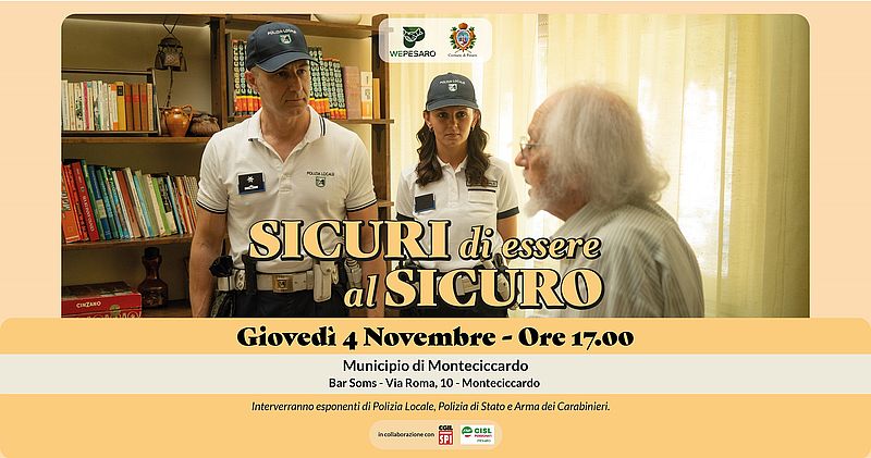 È in programma giovedì 4 novembre, alle 17, al bar Soms di via Roma 10, Municipio di Monteciccardo, “Sicuri di essere al sicuro” la campagna promossa dal Comune di Pesaro in collaborazione con Cigl e Cisl per contrastare e prevenire le truffe agli anziani.