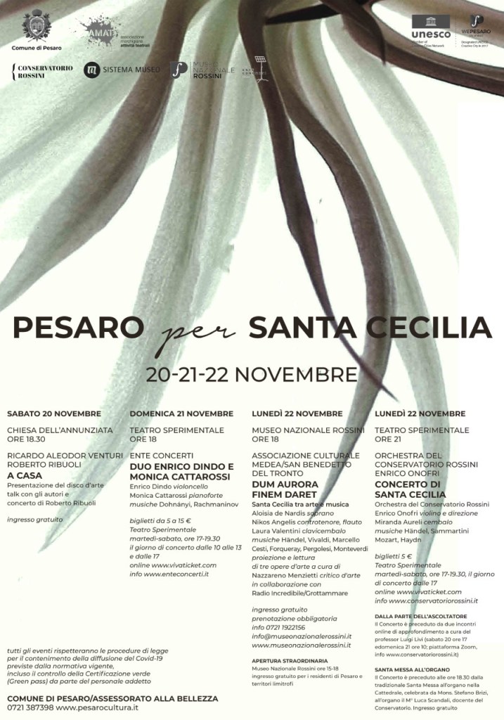 Il Concerto di Santa Cecilia sarà preceduto alle ore 18.30 dalla tradizionale Santa Messa all’organo nella Cattedrale, celebrata da Mons. Stefano Brizi (Vicario Generale Arcidiocesi Pesaro), all’organo il M° Luca Scandali, docente del Conservatorio. Ingresso gratuito