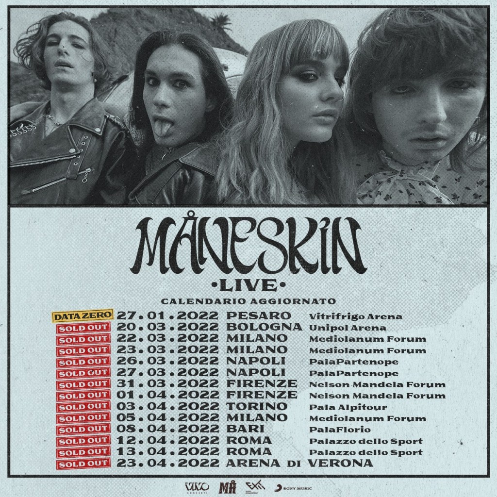 Con il loro sound crudo, energico e distorto i Måneskin stanno riportando il rock’n’roll ai vertici delle classifiche internazionali in un perfetto mix con i gusti contemporanei. Victoria (basso), Damiano (voce), Thomas (chitarra) ed Ethan (batteria), tutti ventenni, hanno iniziato come buskers suonando per le strade di Roma nel 2015 e, nel giro di pochi anni, hanno conquistato tutto il mondo diventando fra i più popolari musicisti rock della nuova generazione. Contano attualmente oltre 3,4 miliardi di streaming su tutte le piattaforme digitali e più di 38 milioni di ascoltatori mensili su Spotify. Dopo il successo dell’album “Il ballo della vita” (uscito il 26 ottobre 2018), a cui è seguito un lungo tour in tutta Europa e nei principali club e festival italiani, il 30 ottobre 2020 i Måneskin pubblicano il nuovo singolo “VENT’ANNI”. Vincono la 71a edizione del Festival di Sanremo con il brano “ZITTI E BUONI” e trionfano all’Eurovision Song Contest a Rotterdam, conquistando il primo posto, con un successo internazionale consacrato in poche settimane da numerosi dischi d’oro e di platino collezionati in oltre 15 Paesi nel mondo. Il 19 marzo 2021 esce il secondo album “Teatro d’ira – Vol. I”, a cui seguirà una tournée sold out (organizzata e prodotta da Vivo Concerti) nelle principali città europee, oltre a un tour nei palazzetti italiani previsti per il 2022, per culminare poi con un concerto evento al Circo Massimo il 9 luglio 2022. Il 15 luglio 2021 presentano con una première mondiale su YouTube il videoclip di “I WANNA BE YOUR SLAVE” ottenendo in sole 24 ore 6,7 milioni di visualizzazioni, finendo in tendenza in 67 Paesi e posizionandosi alla numero #20 nella classifica mondiale dei migliori artisti. La canzone vanta anche una straordinaria versione in collaborazione con la leggenda del rock Iggy Pop, uscita il 6 agosto 2021. I Måneskin si sono distinti con altri strabilianti primati, conquistando la #1 posizione della Top 50 Global Chart di Spotify con “Beggin’”, brano che assieme a “I WANNA BE YOUR SLAVE” si è classificato anche nella Uk Singles Charts – rispettivamente in posizione #10 e #6 – confermando così la band come il primo gruppo italiano della storia con due singoli contemporaneamente nella Top Ten britannica. Il 25 settembre si esibiscono da headliner insieme a Doja Cat e Ed Sheeran all’evento Global Citizen Live 2021 da Parigi. L’8 ottobre esce il nuovo singolo “MAMMAMIA”, che debutta alla posizione #24 della Classifica Global di Spotify, il più alto debutto in classifica fra le nuove uscite e il più alto di sempre per la band. Nell’autunno 2021 volano negli Stati Uniti per due speciali show a New York e Los Angeles, anticipati dal debutto televisivo americano all’iconico Tonight Show con Jimmy Fallon. Il 6 novembre si esibiscono come special guest al concerto dei Rolling Stones a Las Vegas e l’ 8 novembre sono ospiti del popolare talk-show The Ellen DeGeneres Show. La band ottiene il premio “Best Rock” agli MTV EMAs 2021, prima vittoria di un artista italiano in una categoria internazionale, oltre ad una candidatura agli American Music Awards 2021 come “Favorite Trending Song” con “Beggin’”. Con la conquista della #1 posizione nella classifica US Rock Airplay, il brano segna la più rapida ascesa per una nuova band alla numero uno nella US Alternative Airplay negli ultimi 24 anni. Ricevono il prestigioso invito da parte dell’Academy al museo dei Grammy per leggere le nomination della 64esima edizione.