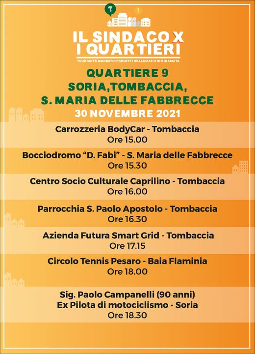 Partenza alle 15 dalla Tombaccia, per un saluto alla Carrozzeria BodyCar. Il tour proseguirà al Bocciodromo “D. Fabi” di S. Maria delle Fabbrecce, poi Centro Socio Culturale Caprilino, Parrocchia S. Paolo Apostolo, Azienda Futura Smart Grid, Circolo Tennis Pesaro a Baia Flaminia. Durante il giro del quartiere il sindaco incontrerà anche l’ex Pilota di motociclismo Paolo Campanelli.