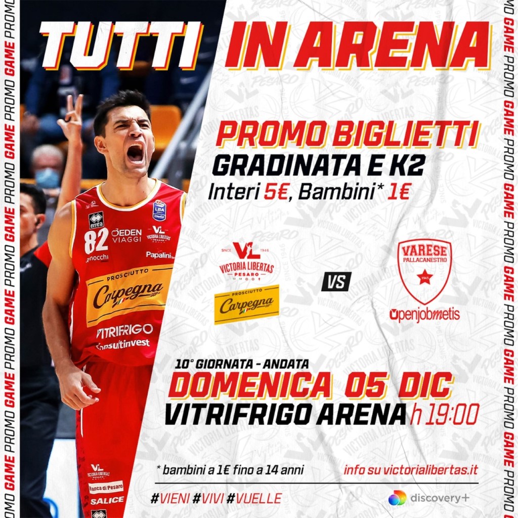 La Carpegna Prosciutto Basket Pesaro comunica che sono acquistabili i biglietti in vista del match tra i biancorossi e la OpenJobMetis Varese in programma domenica 5 dicembre alle 19:00 alla Vitrifrigo Arena nei punti vendita di seguito indicati: