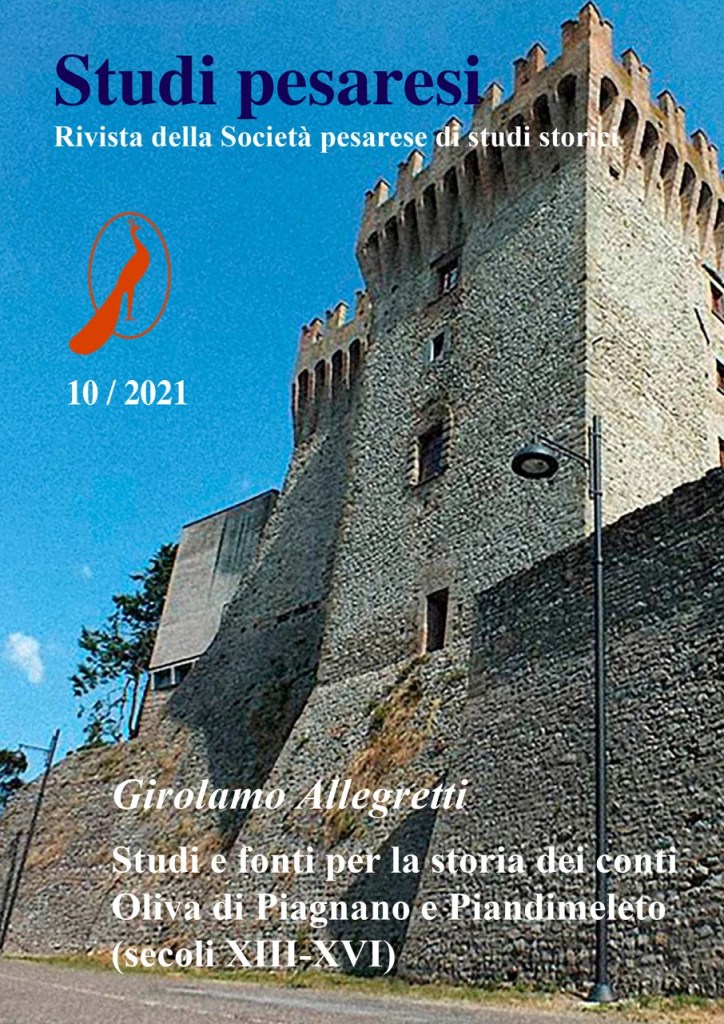 Giovedì 16 dicembre 2021 alle ore 18,00 presso l’auditorium (g.c.) di palazzo Montani (piazza Antaldi, 2 – Pesaro) viene presentato il n. 10 di “Studi pesaresi”, rivista della Società pesarese di studi storici, recante Studi e fonti per la storia dei conti Olivadi Piagnano e di Piandimeleto (secoli XIII-XVI)di Girolamo Allegretti. Nonostante l’esiguità demografica, economica e strategica dei loro domini, gli Oliva seppero farsi onore prima come officiali di altissimo livello (podestà, capitani di giustizia, governatori, ecc.) nelle maggiori città dell’Italia centrale, e poi come condottieri, valorosi e leali, contesi dalle maggiori potenze. Di loro resta uno splendido lascito monumentale: le eleganti lastre tombali tardogotiche in Sant’Agostino di Piandimeleto, la magnifica cappella rinascimentale in San Francesco di Montefiorentino, il palazzo comitale di Piandimeleto con i suoi ornati lapidei; e poi un calice, un libro d’ore, le formelle araldiche nel palazzo del Bargello a Firenze. A fronte di tanta ricchezza monumentale sta un vuoto documentale immenso, e solo negli ultimi cent’anni gli storici hanno preso a interessarsi di questa dinastia appenninica con contributi o parziali o non sempre solidamente documentati. I saggi raccolti in questo volume, editi e inediti, si avvalgono di nuove edizioni di fonti (cui qui si aggiunge l’edizione delle lettere degli Oliva ai Medici) e di ostinate ricerche d’archivio anche in fonti finora non considerate, quali gli atti notarili.Girolamo Allegrettiha diretto per vent’anni “Studi montefeltrani” e “Pesaro città e contà”; ha inoltre ideato e diretto “Costellazione”, collana di agili monografie sui centri minori del comune di Pesaro, e la collana in nove volumi “Storia dei castelli della Repubblica di San Marino”. La sua riflessione storica sconfina su luoghi, territori, personaggi e fenomeni di Marche Romagna Toscana e Lazio; ultimo un lungo saggio sull’illuminista teramano Melchiorre Delfico. Altri suoi studi hanno riguardato i casanolanti, la crisi di fine ‘500, l’emigrazione stagionale transappenninica, la produzione e il commercio del guado.