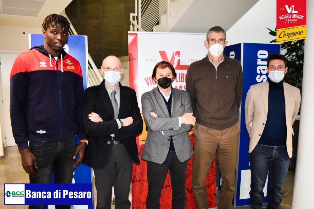 Presso la sede di Banca di Pesaro in via Fratelli Cervi la Carpegna Prosciutto Basket Pesaro ha presentato il rinnovo della partnership che anche in questa stagione – e ininterrottamente dal 2005 – vede l’istituto di credito al fianco della società biancorossa. Alla conferenza stampa hanno preso parte il Presidente della Vuelle Ario Costa, il giocatore Gora Camara, il Presidente di Banca di Pesaro Massimo Tonucci, il direttore generale Paolo Benedetti e il responsabile marketing Andrea Ceccolini.