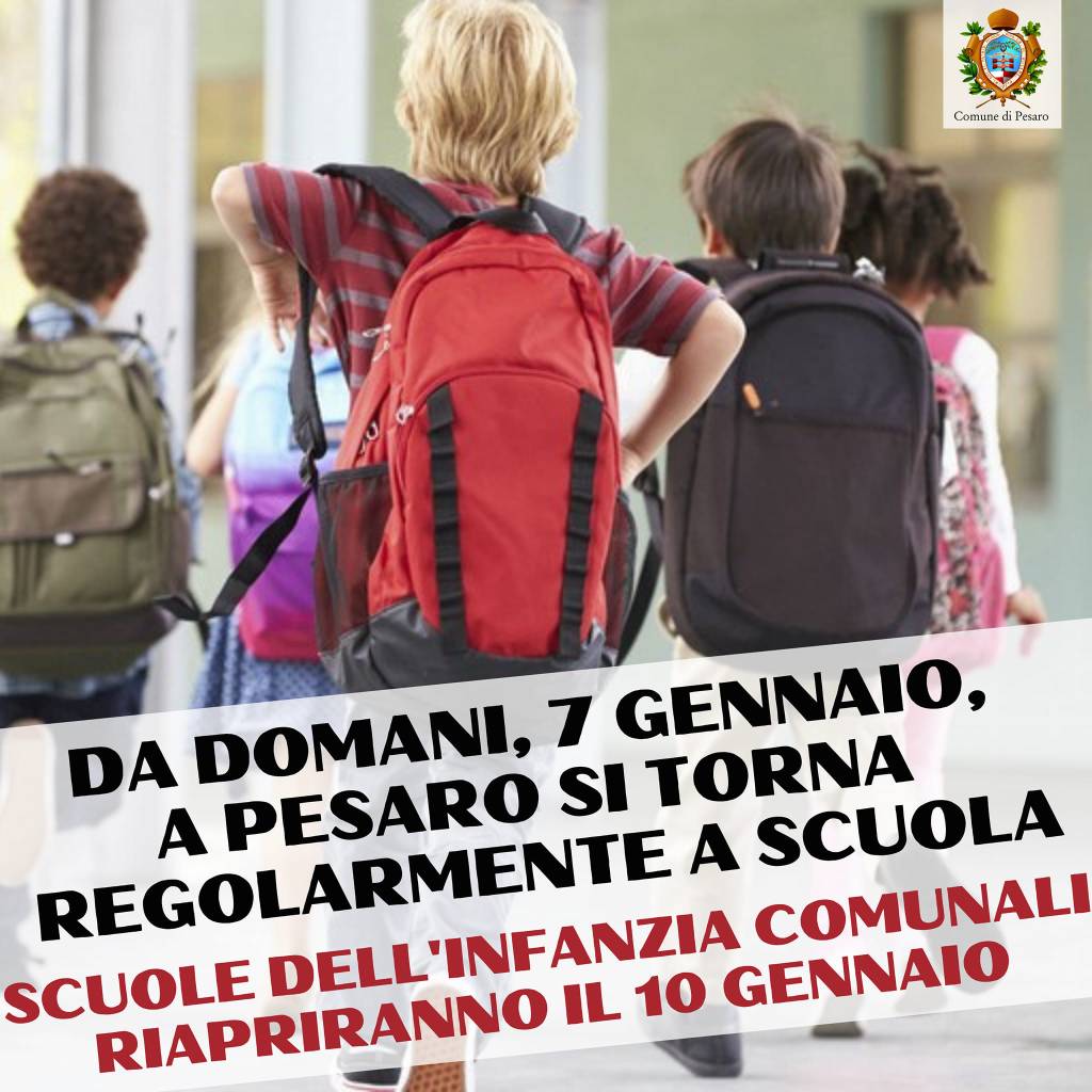 «Da domani, 7 gennaio, a Pesaro si torna regolarmente a scuola». Lo afferma il sindaco Matteo Ricci, che spiega: «La Regione Marche non ha previsto ordinanze specifiche, quindi non essendoci particolarità nella nostra città le lezioni riprenderanno venerdì»