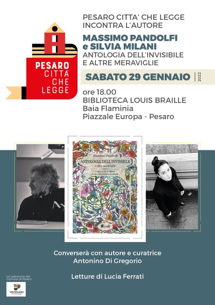 Continuano gli incontri con gli autori promossi da Pesaro Città che Legge: un’occasione per incontrare scrittori già amati – o per scoprirne di nuovi – che raccontano i loro libri più recenti ma anche la loro esperienza di scrittura. Sabato 29 gennaio alle 18 in una delle Biblioteche di Quartiere più amate e frequentate della città: la Biblioteca Louis Braille di Baia Flaminia (piazza Europa). Questa volta l’appuntamento è con Massimo Pandolfi e la sua Antologia dell’invisibile e altre meraviglie, a cura di Silvia Milani, 2021, in.edit edizioni, una raccolta di racconti scritti dal 1971 ad oggi. A conversare con Pandolfi e Milani ci sarà Antonino Di Gregorio. In programma anche letture di brani del libro a cura di Lucia Ferrati.