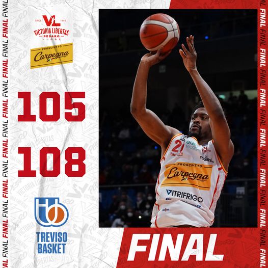 CARPEGNA PROSCIUTTO BASKET PESARO – NUTRIBULLET TREVISO 105-108 dopo overtime (17-27; 43-47; 67-68; 92-92)