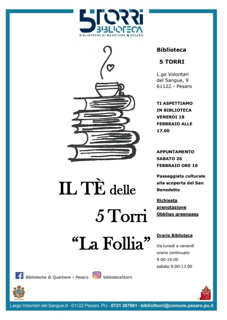 | IL TE’ DELLE 5 TORRI Venerdì 18 febbraio alle 17, appuntamento alla Biblioteca 5 Torri per un nuovo appuntamento de ‘Il Tè delle 5 Torri’, la rassegna per ritrovarsi davanti a una tazza di tè fumante e chiacchierare su un tema ogni volta diverso; al pomeriggio conviviale segue poi una seconda data con un’uscita alla scoperta di luoghi – e non solo – della città per fare un’esperienza diretta legata all’argomento affrontato in biblioteca. La tappa di febbraio è dedicata alla follia, letta nelle parole di Paolo Teobaldi, Vittoria Mas e Patrick McGrath solo per citare alcuni autori; sarà un viaggio tra Otto e Novecento alla scoperta del vissuto della pazzia e di come nel tempo è stata letta e trattata all’interno dei luoghi di cura. E poi sabato 26 febbraio alle 10, in programma una passeggiata attorno al San Benedetto, ex ospedale psichiatrico e luogo iconico della geografia urbana; il percorso sarà accompagnato dalle immagini e dai racconti del fotografo Umberto Dolcini. Ad ogni incontro verrà consegnata una piccola bibliografia con qualche suggerimento di lettura. L’iniziativa rientra nel programma di attività di Pesaro Città che legge, rete di cui le biblioteche di Quartiere rappresentano un tassello sempre attivo e capace di offrire occasioni diverse per amare la lettura; perché una comunità che legge vive meglio ed è più civile. Gradita prenotazione. Info: Biblioteca 5 Torri, largo Volontari del Sangue 9, 0721 387961, biblio5torri@comune.pesaro.pu.it Comune di Pesaro |