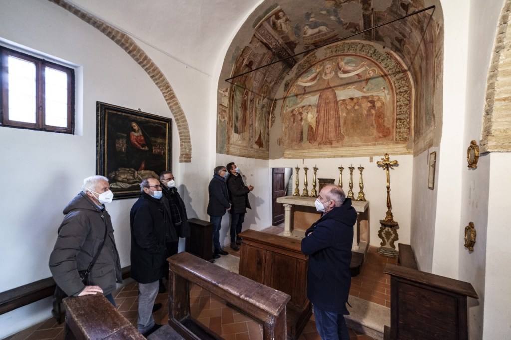URBINO – La Provincia interverrà sulla chiesetta della Madonna dell’Homo di via Pacioli, sede del prezioso affresco di Ottaviano Nelli ‘Madonna della Misericordia’, risalente alla prima metà del ‘400. «In primo luogo i lavori riguarderanno la manutenzione del tetto. Ma valutiamo il percorso più adatto anche per il restauro dell’affresco e per il risanamento delle piccole lesioni murarie presenti», sottolinea il presidente della Provincia Giuseppe Paolini, dopo il sopralluogo odierno condotto con il direttore generale Marco Domenicucci. Sul posto anche il vicesindaco di Urbino Massimo Guidi e il presidente dell’Accademia Raffaello Luigi Bravi. Oltre a don Daniele Brivio, sacerdote della SS. Annunziata, parrocchia interessata dalla convenzione d’uso con l’ente di via Gramsci, proprietario della chiesetta dal 1962. Si guarda alla riapertura delle tradizionali attività e delle celebrazioni liturgiche per l’estate, in particolare in occasione della festività dell’Auxilium Christianorum. «Restituendo così alla città di Urbino e al territorio un luogo straordinariamente rilevante sul piano religioso, storico e artistico», commenta Paolini. «Studieremo un intervento non invasivo, rispettoso della struttura e dell’opera che racchiude». La sinergia è condivisa con il presidente dell’Accademia Raffaello Luigi Bravi: «Ho fatto presente la necessità del restauro – spiega il professore – e c’è estrema soddisfazione per l’attenzione che la Provincia intende riservare a questo gioiello. Si tratta di una bella operazione per renderlo pienamente visibile e fruibile. Considerato che la zona è altamente frequentata anche dagli studenti delle scuole». Nelli, insieme ai fratelli Salimbeni, portò a Urbino il gotico internazionale nel corso di due soggiorni prolungati, risalenti intorno al 1416 e al 1430. Il pittore è stato di recente celebrato a Gubbio, in una mostra che ha incluso alcune tra le sue opere più significative. Un percorso espositivo che ha suggerito, tra l’altro, anche l’itinerario urbinate proprio con gli oratori di San Gaetano e della Madonna dell’Homo, sorta a cavallo tra XIV e XV secolo attorno a un’edicola all’aperto.