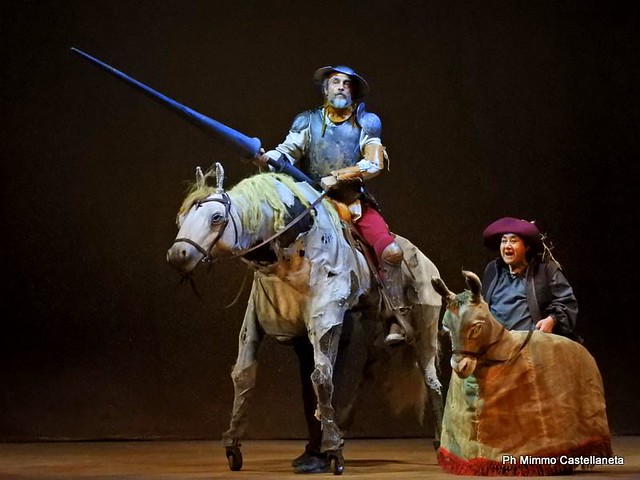 ‘Credo che questo spettacolo possa funzionare come una terapia di gruppo: si tratta di due ore di spensieratezza, perché questa è la prima cosa che vogliamo regalare ma sul filo di un pensiero che riguarda l’essere umano e la sua avventura più bella e importante, ovvero la ricerca di se stessi. Da questo punto di vista, Don Chisciotte è la metafora più bella. Abbiamo pensato a questo spettacolo come a una favola per adulti con dentro l’entusiasmo dei bambini per cui tutto può essere e diventare qualcos’altro. La scenografia e i costumi esibiscono la loro estetica in modo fanciullesco, giochiamo con la fantasia, la trovata scoppiettante. Un’iniezione di immaginazione, facoltà che, quando si diventa adulti, rischia l’atrofia. Dovremmo conservare lo sguardo dell’infanzia. Lo diceva anche Picasso: a dodici anni dipingevo come Raffaello, ma ci ho messo una vita a imparare a dipingere come un bambino’.
