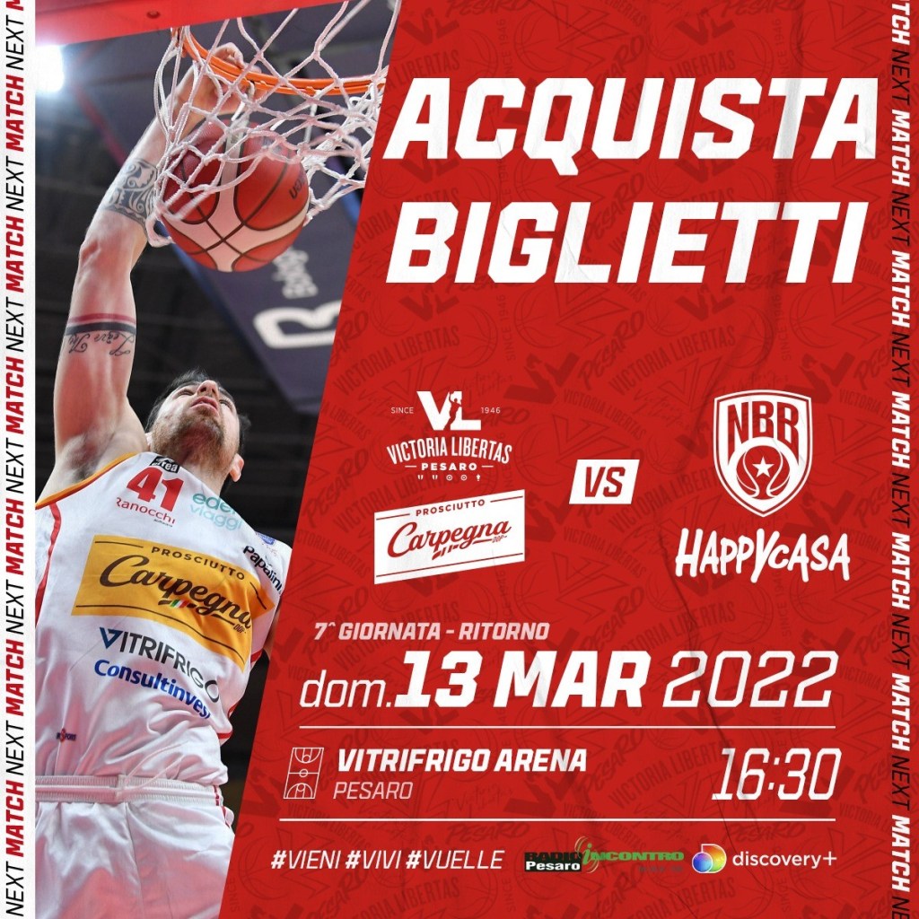 La Carpegna Prosciutto Basket Pesaro comunica che sono acquistabili i biglietti in vista del match tra i biancorossi e la Happy Casa Brindisi in programma domenica 13 marzo alle 16:30 alla Vitrifrigo Arena nei punti vendita di seguito indicati: