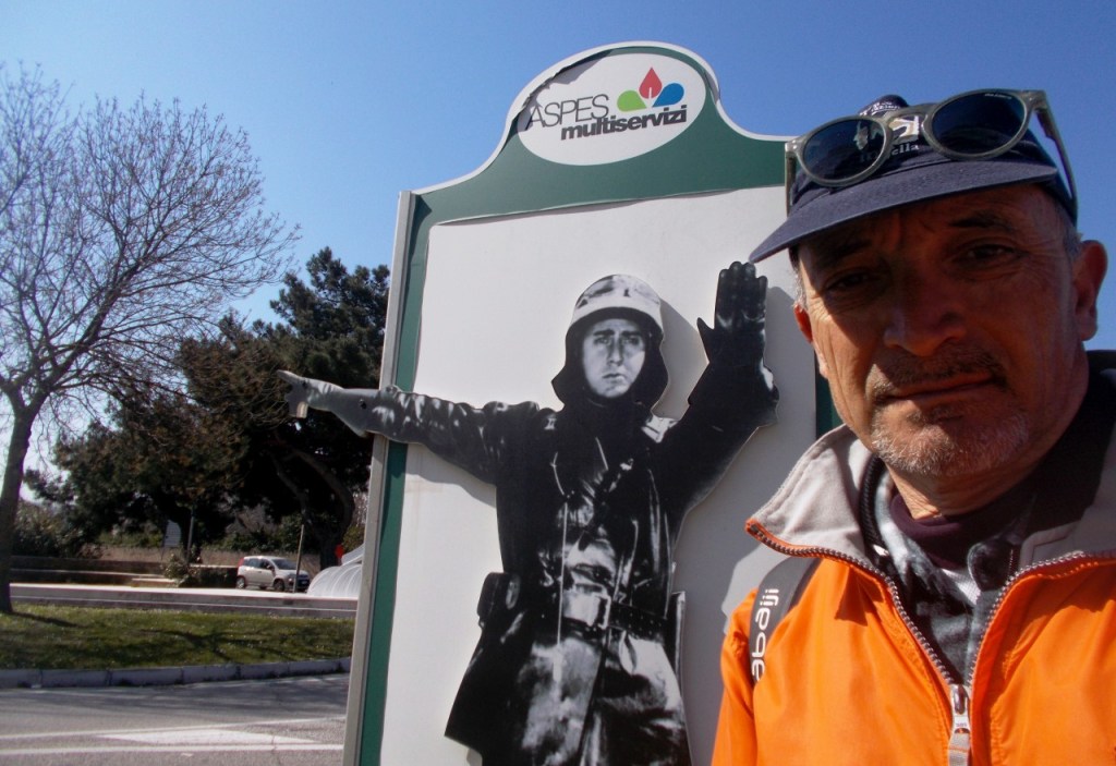 L’attore e regista italiano Alberto Sordi (1920-2003) al massimo della sua bravura ne “Il vigile” di Luigi Zampa con una delle interpretazioni più memorabili, affiancato da Vittorio De Sica (un connubio magistrale) e la partecipazione straordinaria di Sylva Koscina e Mario Riva nel ruolo di sé stessi. Alberto sordi confermò le sue doti interpretative mettendo a punto una serie di ritratti caricaturali dell’italiano medio degli anni Cinquanta e Sessanta. L’icona raffigurante Il “vigile” interpretato da Alberto Sordi indica il Comando di Polizia Municipale di Pesaro in Via Mario del Monaco.