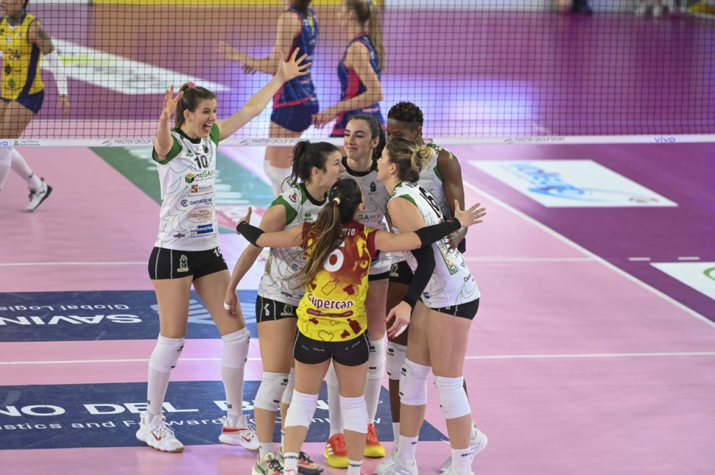 A Scandicci la squadra biancoverde ha saputo restare in partita dall’inizio alla fine, subendo a tratti i break delle fortissime avversarie, ma riuscendo sempre a ribattere colpo su colpo agli strappi di Pietrini, Natalia e Antropova. Berasi ha saputo giostrare da par suo il gioco, portando ben cinque giocatrici in doppia cifra: Mancini 17, Carcaces 16, Bjelica 16, Newcombe 16, Jack-Kisal 14