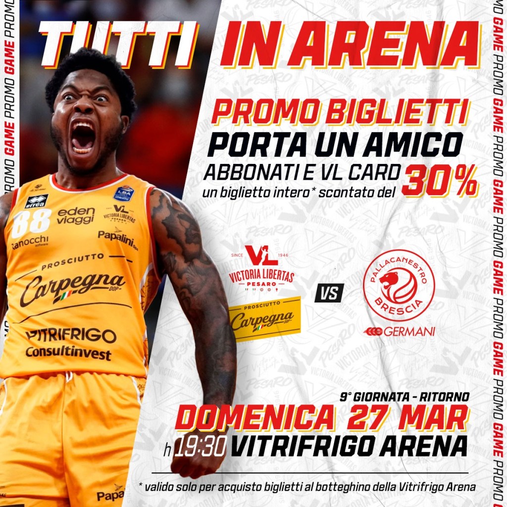 La Carpegna Prosciutto Basket Pesaro comunica che sono acquistabili i biglietti in vista del match tra i biancorossi e la Germani Brescia in programma domenica 27 marzo alle 19:30 alla Vitrifrigo Arena nei punti vendita di seguito indicati: