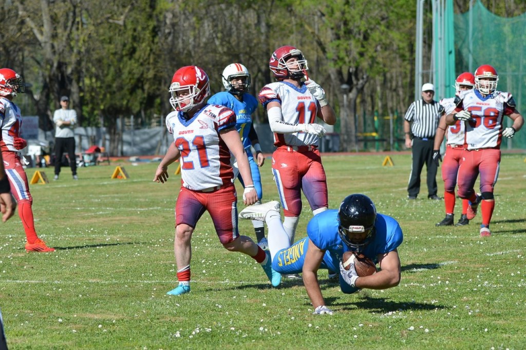 Uno stop inaspettato per i Ranocchi Angels, che cedono 26-6 ai Doves Bologna nel giorno del debutto casalingo. Dopo la buona prestazione sul campo dei Roosters Ravenna ci si attendeva una prova più consistente dai ragazzi di Jack Campbell che invece sbagliano l’approccio al match, subendo tre touch-down nel corso del 1° tempo. L’attacco pesarese fatica a carburare e nei primi drive non riesce a produrre un gioco proficuo. Prima dell’intervallo, però, gli Angels riescono a sfondare accorciando sul 20-6 e provano a riorganizzarsi. La ripresa, infatti, è molto più equilibrata, ma i padroni di casa perdono per infortunio due pedine importanti, il runningback e un linebacker centrale, non riuscendo più a segnare, mentre i Doves trovano un altro touch-down per arrotondare il risultato.