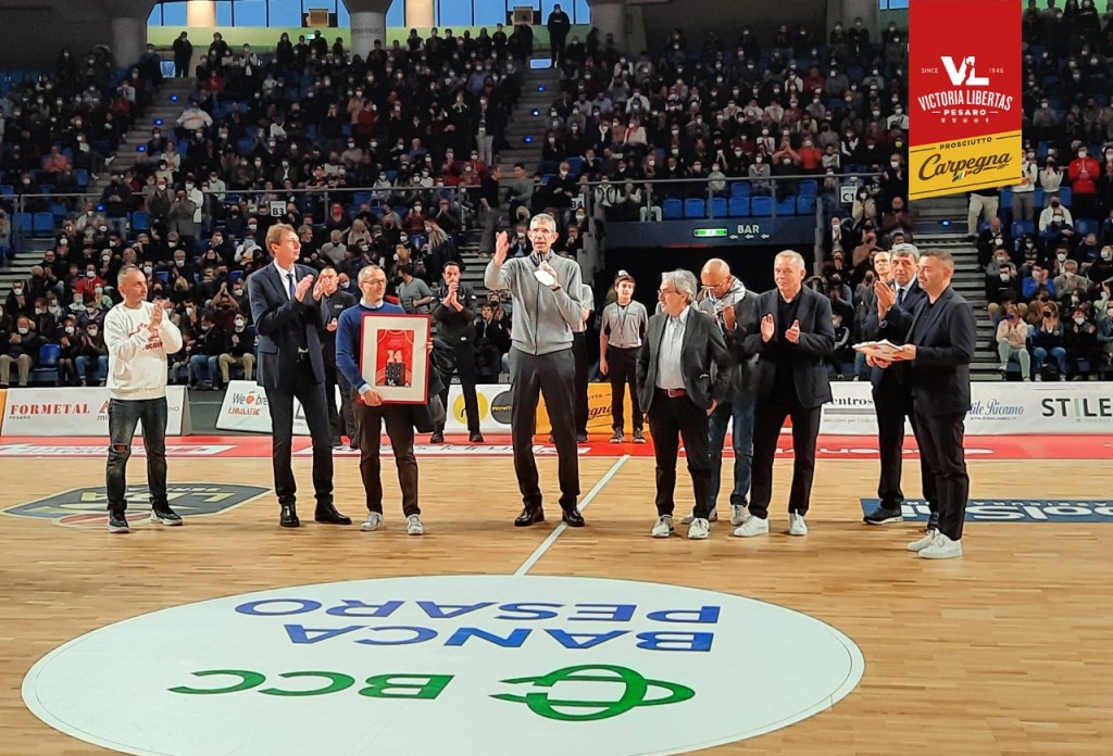 Migliaia i tifosi della Vuelle presenti alla Vitrifrigo Arena che hanno assistito all’evento dedicato al Presidente del club marchigiano.