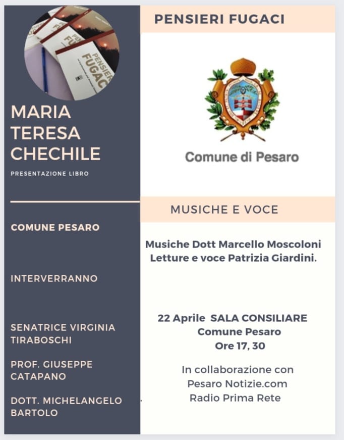 Maria Teresa Chechile presenterà il suo libro “Pensieri fugaci” il 22 Aprile 2022 nella Sala Consiliare del Comune di Pesaro, alle ore 17,30.