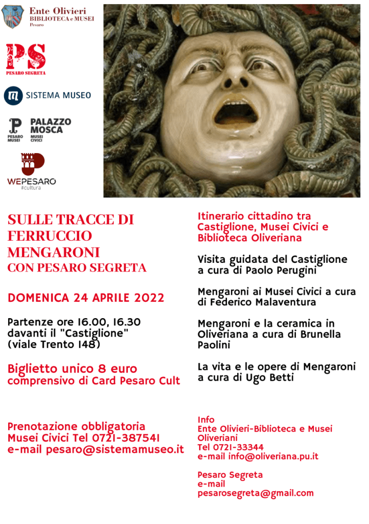 Nel percorso di domenica 24 aprile, si seguiranno le testimonianze della produzione di Ferruccio Mengaroni rintracciabili in diverse sedi coinvolte nel percorso accompagnato da Pesaro Segreta. Si parte dal ristorante il Castiglione (viale Trento 148), dove risiedeva Mengaroni e dove si trovava il suo laboratorio, la visita guidata è a cura di Paolo Perugini; si prosegue a Palazzo Mosca – Musei Civici: qui Federico Malaventura parlerà del ceramista illustrando alcune opere presenti nelle collezioni fra cui la grande “Medusa” nella corte di cui si narrerà la vicenda. Infine, tappa alla Biblioteca Oliveriana di Palazzo Almerici (via Mazza) che offre un’interessante esposizione di documenti su Mengaroni: qui il gruppo dei partecipanti verrà accolto dalla direttrice Brunella Paolini e dallo staff. Finale in sala Passeri con Ugo Betti, presidente di Pesaro Segreta, per la proiezione del video realizzato dall’associazione sulla vita e le opere dell’artista.