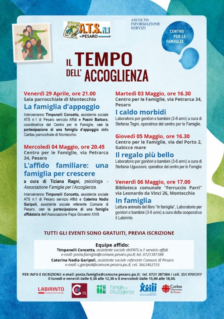 Formare e sensibilizzare la cittadinanza sull’affido per aumentare il numero di famiglie disponibili: è l’obiettivo de “Il tempo dell’accoglienza” la settimana promossa dal Centro per le famiglie dell’ATS1, con il sostegno, in particolare, dell’equipe dedicata del Comune di Pesaro e delle associazioni del territorio in programma da venerdì 29 aprile a venerdì 6 maggio.