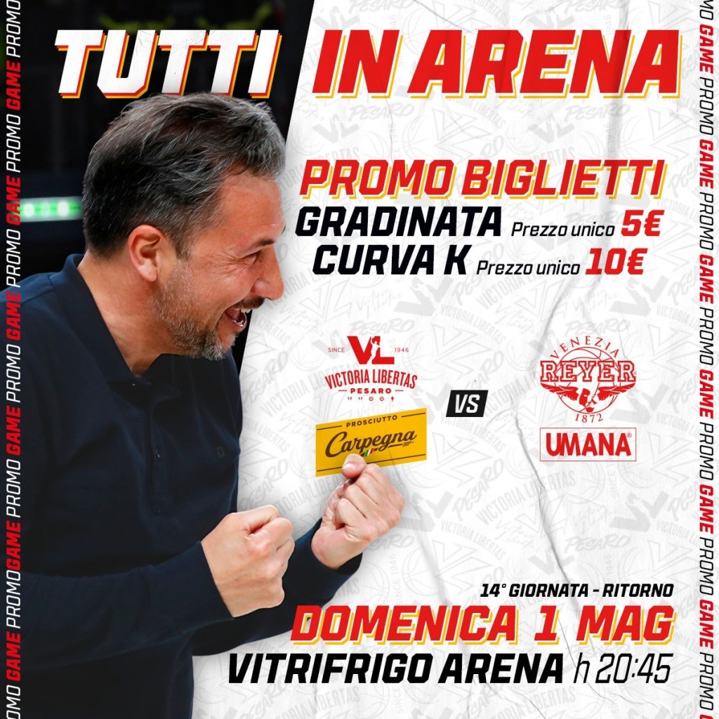 La Carpegna Prosciutto Basket Pesaro comunica che sono acquistabili i biglietti in vista del match tra i biancorossi e la Umana Reyer Venezia in programma domenica 1 maggio alle 20:45 alla Vitrifrigo Arena nei punti vendita di seguito indicati: