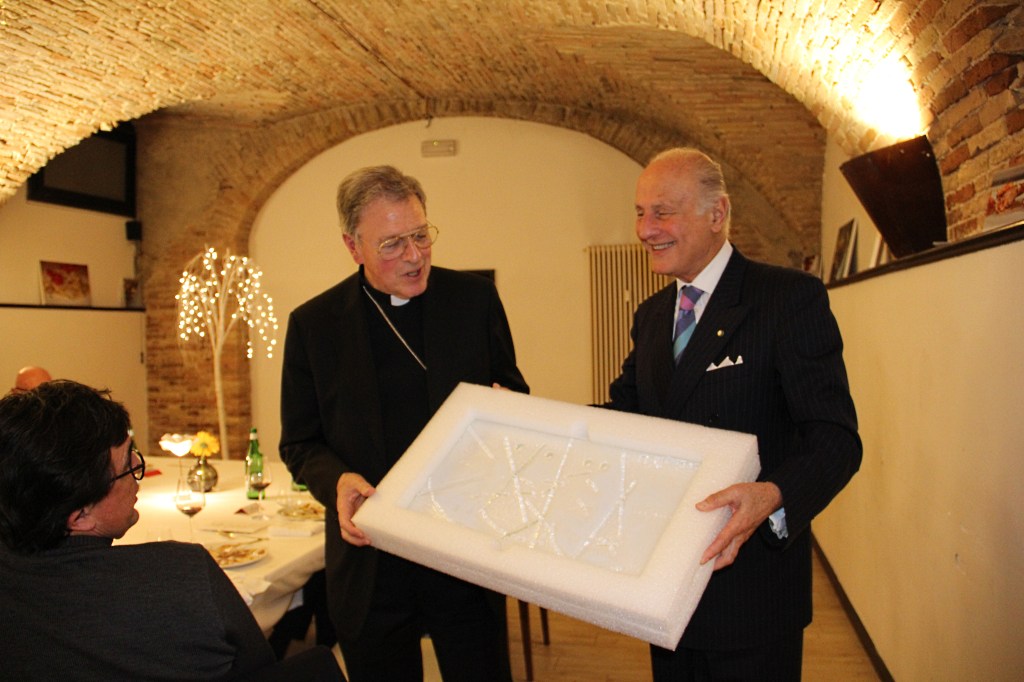 annuale “Messa solenne con Canto Gregoriano” Lei, con le Sue omelie, ci ha donato preziosi motivi di riflessione concorrendo al nostro accrescimento spirituale. Ed una forte impronta Lei ha lasciato nelle periodiche commemorazioni della scomparsa di Alcide De Gasperi non solo ammettendo il Centro Studi Sociali pesarese a lui intitolato alla partecipazione, nella Chiesa Cattedrale, alla S. Messa in suo ricordo, ma anche favorendo la presenza ed accogliendo le elevate personalità della Chiesa che di volta in volta hanno rievocato i grandi meriti dello Statista e la sua esemplare figura di cristiano. Sono spunti minuti, questi, del ben ampio patrimonio di affetto e di valori da Lei donati in tutti questi anni alla comunità pesarese la quale, con gratitudine, cercherà di farne tesoro. Da parte mia e dei miei familiari le rinnovo devoti sentimenti di riconoscenza unitamente agli auguri più vivi per i delicati compiti in elevate entità della Chiesa che opportunamente perdurano nella Sua agenda”.