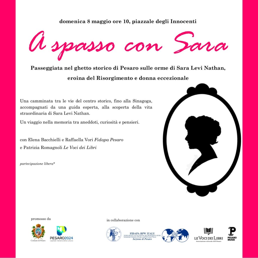 È in programma domenica 8 maggio, “A spasso con Sara”, la passeggiata gratuita nel ghetto storico di Pesaro, “sulle orme di Sara Levi Nathan, eroina del Risorgimento e donna eccezionale”. L’appuntamento, promosso dal Comune di Pesaro in collaborazione con Fidapa BPW Italy, sezione di Pesaro, Le Voci dei Libri e Pesaro Musei, si propone come un «viaggio nella memoria tra aneddoti, curiosità e pensieri – sottolinea Camilla Murgia, assessora alla Crescita e alla Gentilezza – che sarà bello compiere per conoscere meglio la storia e la vita di Sara Levi Nathan, una donna straordinaria, madre di 12 figli, che ha saputo coniugare la vita personale con l’impegno sociale».