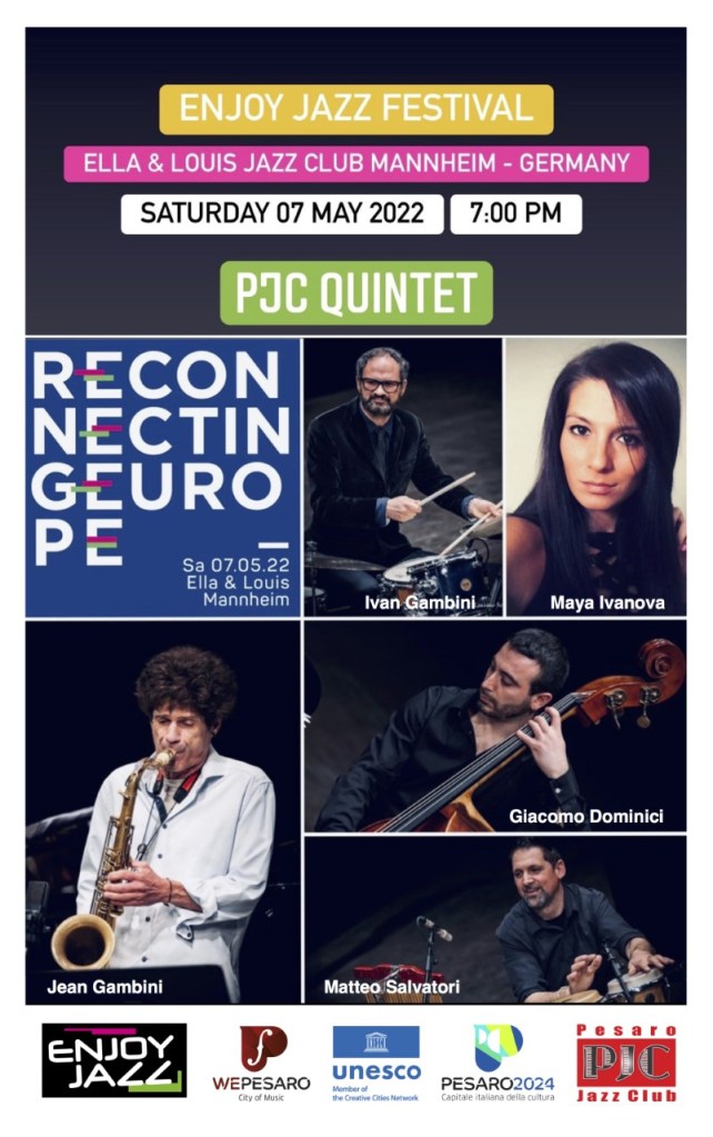 Nel programma di Reconnecting Europe anche l’’Enjoy Jazz. Festival for Jazz and More’, la manifestazione che riunisce le band della rete europea delle città creative UNESCO nella regione metropolitana del Reno-Neckar. L’apertura della serata di concerti di sabato 7 maggio (ore 19), è affidata al Pesaro Jazz Club con il PJC Quintet, formazione composta da Jean Gambini, Maya Ivanova, Giacomo Dominici, Ivan Gambini, Matteo Salvatori che si esibirà all’”Ella & Louis Jazz Club di Mannheim.