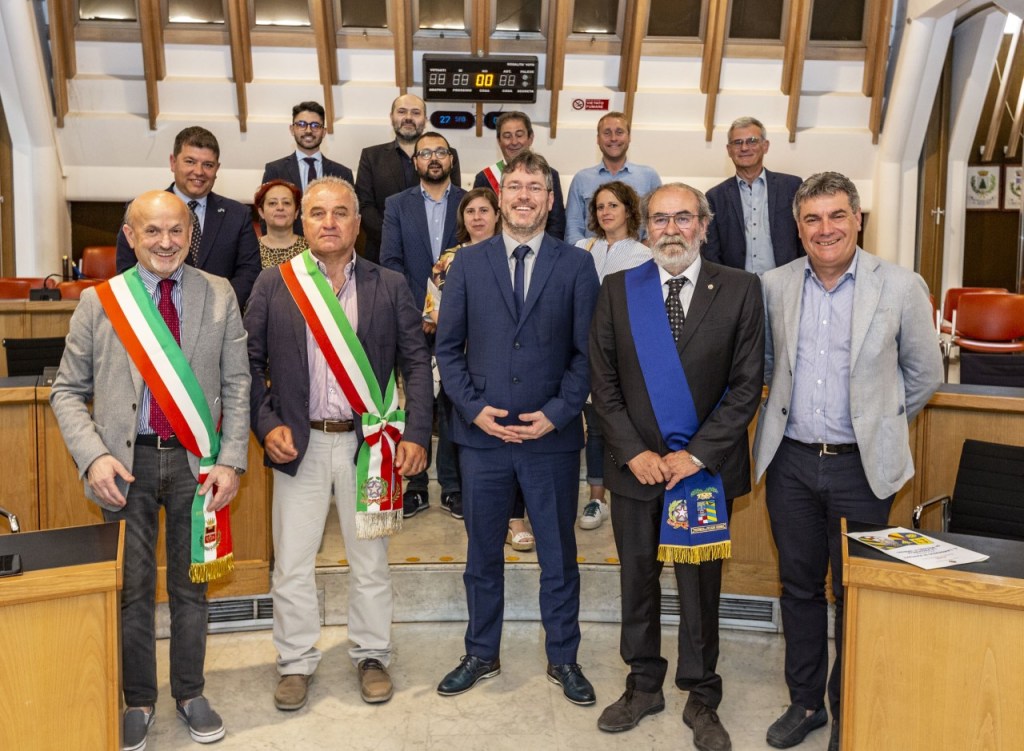 Turismo Etienn Lucarelli, i sindaci di San Costanzo Filippo Sorcinelli, di Montefelcino Osvaldo Pelagaggia, di Vallefoglia Palmiro Ucchielli, il vice sindaco di Pergola Graziano Ilari, l’assessore del Comune di Gabicce Mare Aroldo Tagliabracci, la sindaca di Mercatello sul Metauro e consigliera provinciale Fernanda Sacchi, il consigliere provinciale Domenico Carbone, la consigliera comunale di Colli al Metauro Maria Giovanna Cenerelli con il sindaco della città gemellata di Bietigheim,