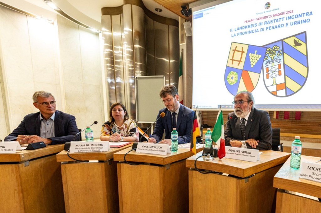 PESARO – I 25 anni di gemellaggio tra Provincia di Pesaro e Urbino e Landkreis di Rastatt verranno celebrati con la partecipazione di una delegazione dell’Amministrazione provinciale in Germania a settembre in occasione della settimana del biologico (all’interno della quale saranno individuate opportunità di promozione delle nostre produzioni) e con l’organizzazione, nel maggio 2023 nel territorio della provincia di Pesaro e Urbino, dei “Giochi del Gemellaggio”, evento ludico – sportivo (già svoltosi con successo in passato a Fano) nel quale verranno coinvolti tutti i Comuni gemellati con altrettanti Comuni del Landkreis di Rastatt. Di questi e di altri progetti comuni si è parlato oggi in Provincia in occasione dell’incontro istituzionale con il neo presidente del Landkreis di Rastatt Christian Dusch, l’assessore Mario Mohr e la responsabile dei gemellaggi Maria Di Umberto, accolti dal presidente Giuseppe Paolini, dal segretario generale Michele Cancellieri, da vari sindaci (molti dei quali delle città gemellate) e consiglieri provinciali.