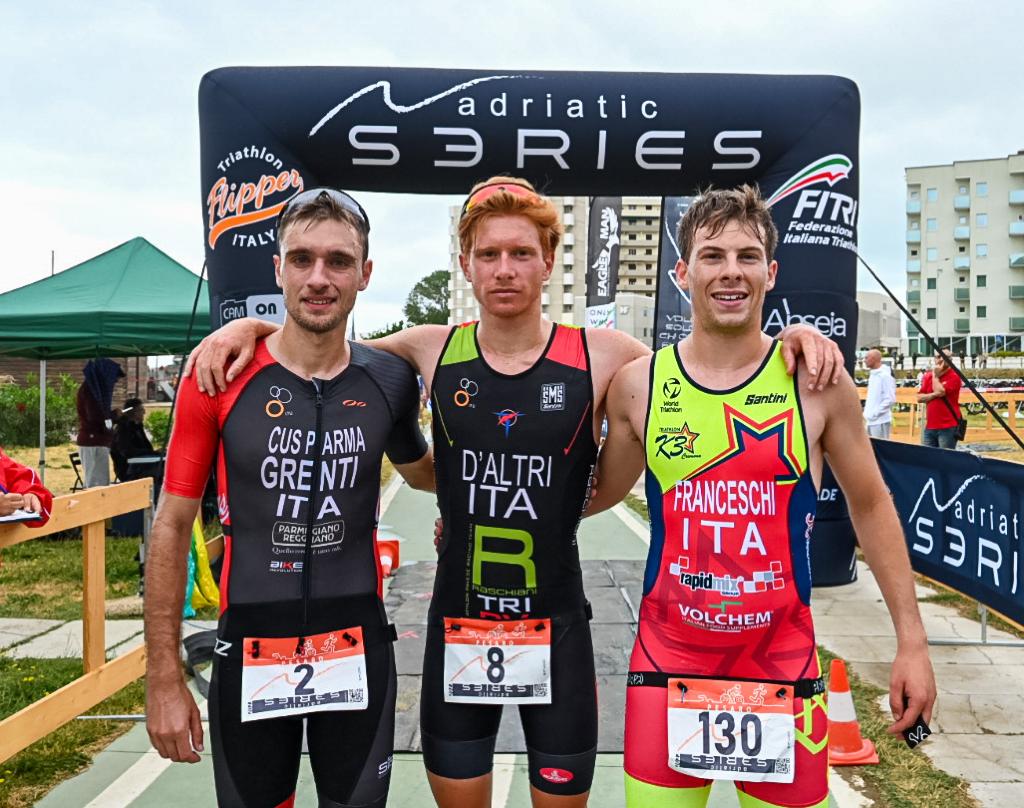 La gara maschile ha visto trionfare Lorenzo D’Altri in 1:37:44: il giovane portacolori del Raschiani Triathlon è entrato per primo in zona cambio al termine dei primi 5K di corsa, nella bici è stato raggiunto da Emanuele Grenti (CUS Parma) con cui è arrivato insieme in T2 e quindi, nella terza e ultima frazione a piedi, ha aperto di nuovo il gas vincendo con 26″ su Grenti. A completare il podio, Marco Franceschi (K3 Cremona) è riuscito a vincere la lunga volata con Daniel Casadei (Raschiani Triathlon), precedendolo di tre secondi.