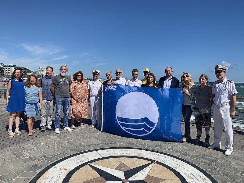 Issata al moletto di viale Nazario Sauro il vessillo assegnato dalla Fee. Vimini e Morotti: «Una bella cartolina per i turisti alla ricerca di un mare che sia di qualità e un riconoscimento al doveroso impegno rivolto alla tutela ambientale messo in campo dall’Amministrazione»