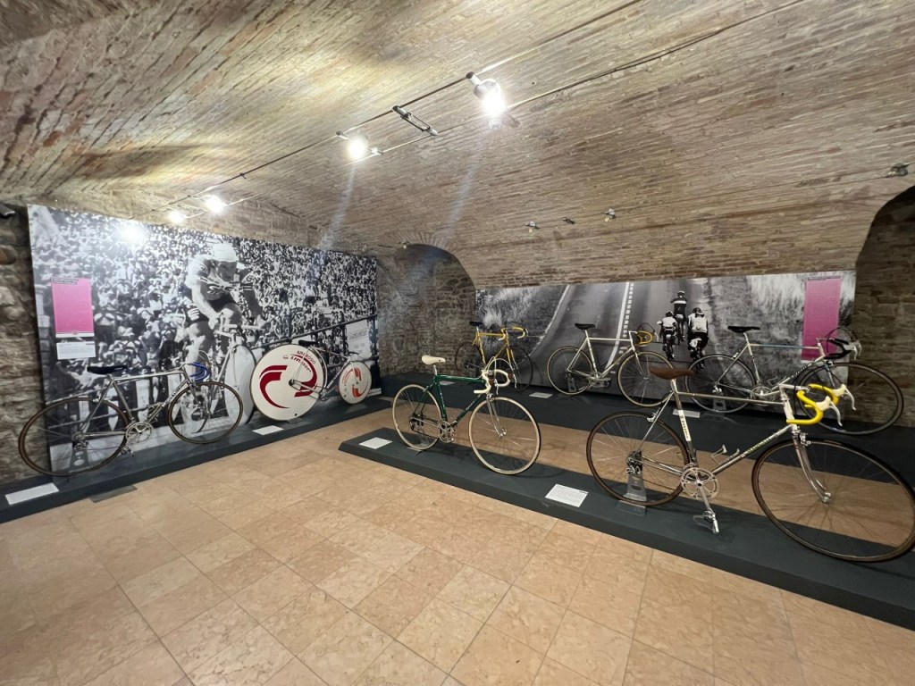 Sarà possibile ammirare le bici da corsa in un excursus cronologico dal 1930 fino ad oggi, fra cui magnifici pezzi storici in ferro e acciaio come quelli utilizzati dai pionieri del ciclismo di inizio novecento: su tutti il primo “Campionissimo” Costante Girardengo. E poi ancora alcuni esemplari coevi a Coppi e Bartali degli anni Cinquanta insieme con altri degli anni Sessanta e Settanta quando campioni quali Baldini, Adorni, Motta, Gimondi, Merckx e il pesarese Enrico Paolini (tre volte campione d’Italia) infiammavano le folle con le loro gesta. Esposta anche la bicicletta originale del record dell’ora del 1988 di Francesco Moser appartenente alla collezione Italian Legend Bicycles. Arricchisce l’esposizione, una sezione che ricorda le grandi donne del ciclismo tra cui Fabiana Luperini vincitrice di tre Giri d’Italia e di tre Tour de France femminili. Non mancano le biciclette del presente dotate di una tecnologia elettronica che le proietta verso il futuro. Ad accogliere il pubblico all’ingresso del museo le immagini del “Campionissimo” Fausto Coppi al mare nella nostra riviera e il suo busto originale. Il museo è stato realizzato anche grazie al contributo della Regione Marche.