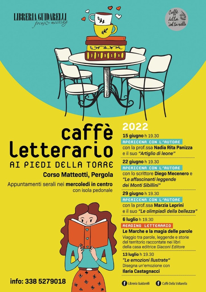 Ai piedi della torre civica, nella splendida cornice del centro storico di Pergola, uno dei borghi più belli d’Italia, all’ora del tramonto, parte mercoledì 15 giugno il Caffè Letterario. Dopo lo stop forzato degli ultimi due anni, la Libreria Guidarelli focus&meeting, la cui storica cartolibreria nel 2021 ha festeggiato ben 100 anni di attività, torna finalmente ad organizzare incontri, laboratori, letture e appuntamenti rivolti sia ai più piccoli che ai grandi, come nel periodo pre pandemia.