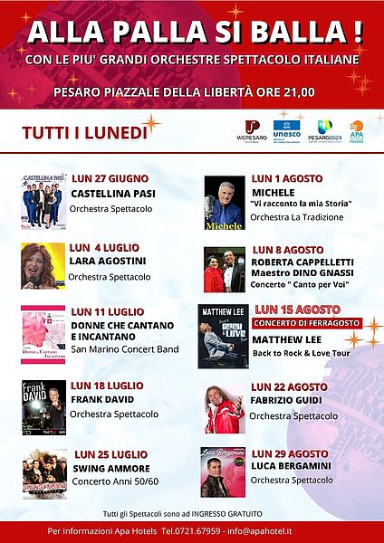 Al via da lunedì 27 giugno gli appuntamenti settimanali, a ingresso gratuito, di “Alla Palla si balla” in piazzale della Libertà promossi dal Comune di Pesaro in collaborazione con Apa Hotels. Ad aprire le danze, alle 21, sarà una delle più famose orchestre d’Italia “Castellina Pasi” guidata da Andrea Barbanera, fisarmonicista, cantante e nuovo leader di questa storica orchestra, l’unica in Italia ad aver conquistato due Dischi d’Oro.