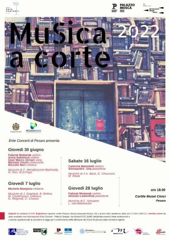 Prende il via la seconda edizione di Musica a Corte, il cartellone organizzato dall’Ente Concerti che segna il proseguimento della collaborazione dell’istituzione concertistica pesarese con il Conservatorio Rossini. Protagonisti saranno infatti giovani talenti, selezionati fra i migliori allievi dell’Istituto pesarese, che si esibiranno in una serie di quattro concerti ospitati nel bel cortile di Palazzo Mosca, sede dei Musei Civici cittadini.