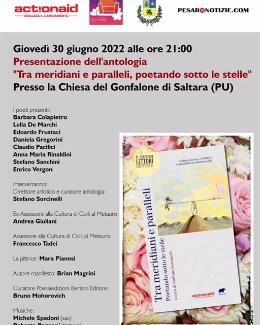 “Tra meridiani e paralleli – poetando sotto le stelle” è stato un micro festival poetico itinerante che ha interessato quattro borghi dell’entroterra della Provincia di Pesaro: Saltara, Serrungarina, Bargni e Pozzuolo.e che ha visto la partecipazione di otto poeti: Barbara Colapietro, Anna Maria Rinaldini, Enrico Vergoni, Daniela Gregorini, Lella De Marchi, Stefano Sanchini, Edoardo Frustaci e Claudio Pacifici. L’iniziativa creata dal poeta fanese Stefano Sorcinelli, con l’allora assessore alla Cultura del Comune di Colli al Metauro Andrea Giuliani, è ora una produzione letteraria voluta dal Coordinatore “poesiaedizioni” della Bertoni Editore, Bruno Mohorovich anche curatore della Collana “Aurora/Verblu” di cui l’antologia fa parte.