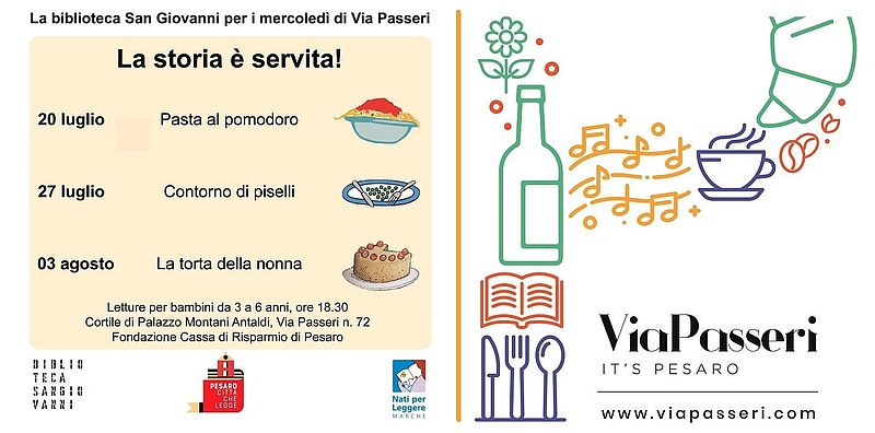 Prima di trascorrere una piacevole serata in Via Passeri c’è un gustoso menù di storie per genitori e bambini, lette ad alta voce dalle bibliotecarie e dalle lettrici volontarie di Nati per Leggere