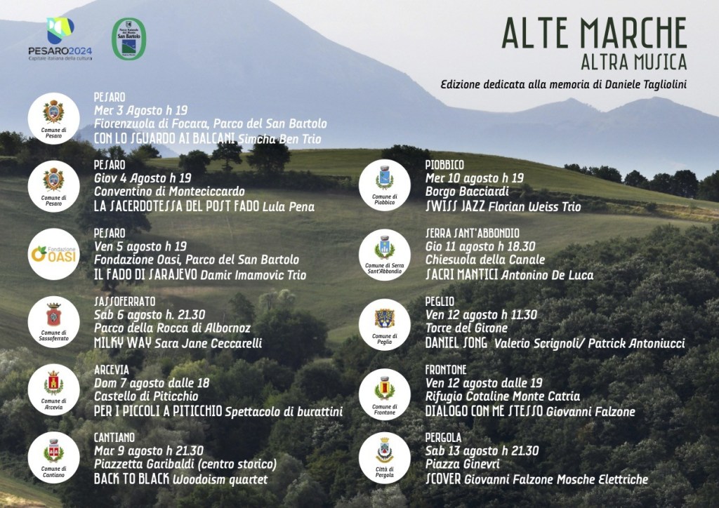 Alte Marche Altra Musica, che ha come main sponsor il Gruppo Hera con il sostegno di Fondazione Cassa di Risparmio di Pesaro e il contributo di Fondazione Oikos dove è stata ospitata l’anteprima a giugno, ritorna a proporre i suoi straordinari appuntamenti sull’Appennino marchigiano per 10 serate che toccheranno alcune delle località più affascinanti delle aree interne delle province di Pesaro e Urbino e di Ancona.