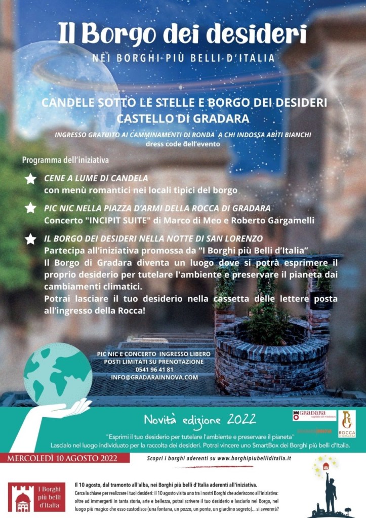 Il borgo di Gradara partecipa all’iniziativa de “I Borghi più Belli d’Italia e diventa un luogo del desiderio, dove ogni persona che visiterà Gradara potrà esprimere il proprio desiderio per tutelare l’ambiente e preservare il pianeta dai cambiamenti climatici e lasciarlo nella cassetta delle lettere posta all’ingresso della Rocca.