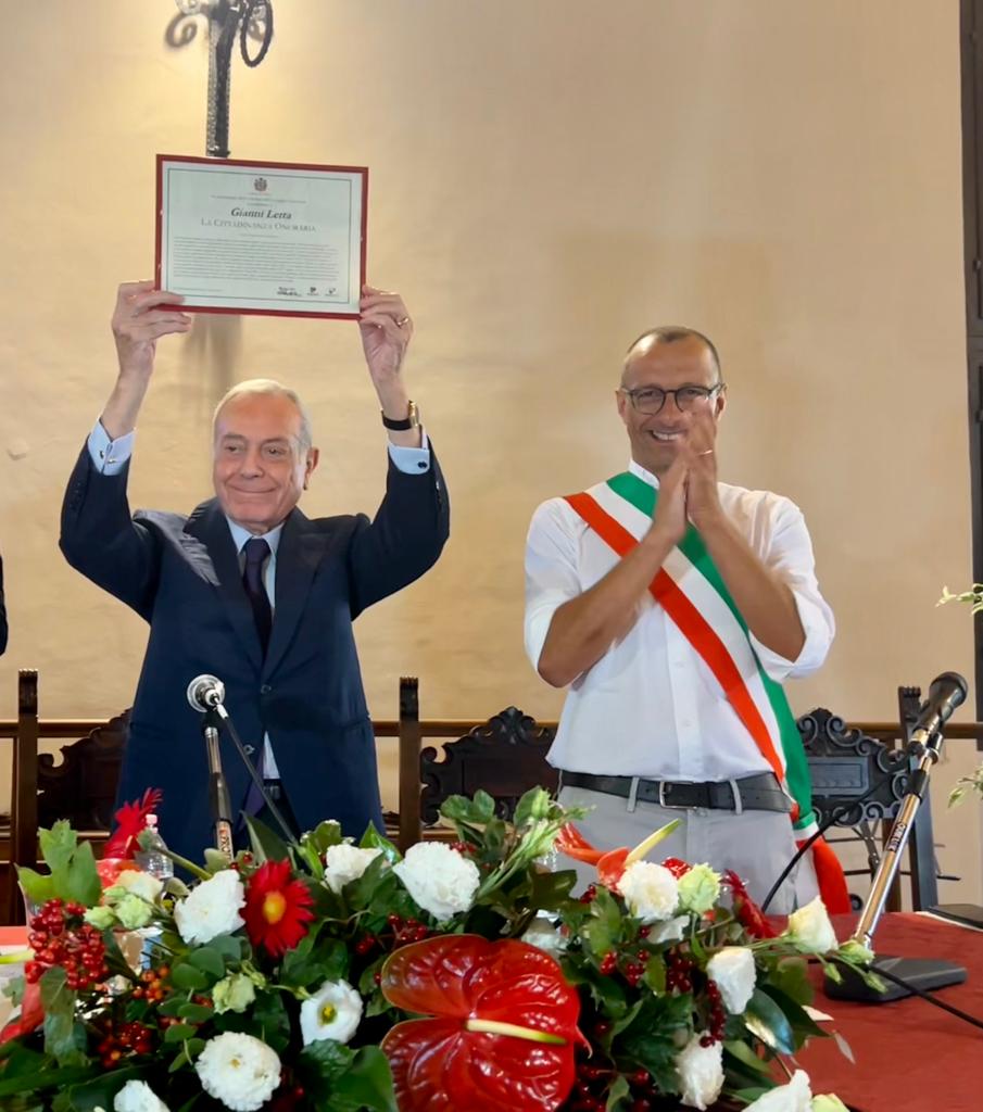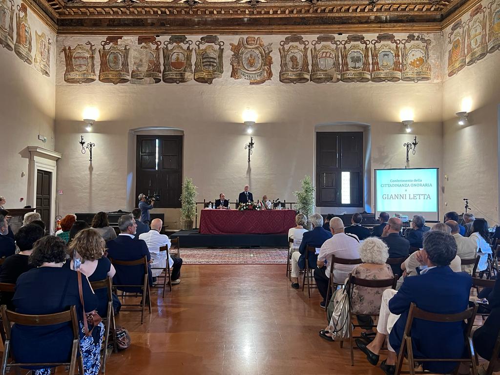 «Orgoglioso ed onorato, cercherò di fare il mio meglio per meritarmi questo riconoscimento». È emozionato Gianni Letta mentre riceve dal sindaco Matteo Ricci e dal vice sindaco Daniele Vimini la Cittadinanza Onoraria, benemerenza che alza al cielo ed esibisce come fosse un trofeo.