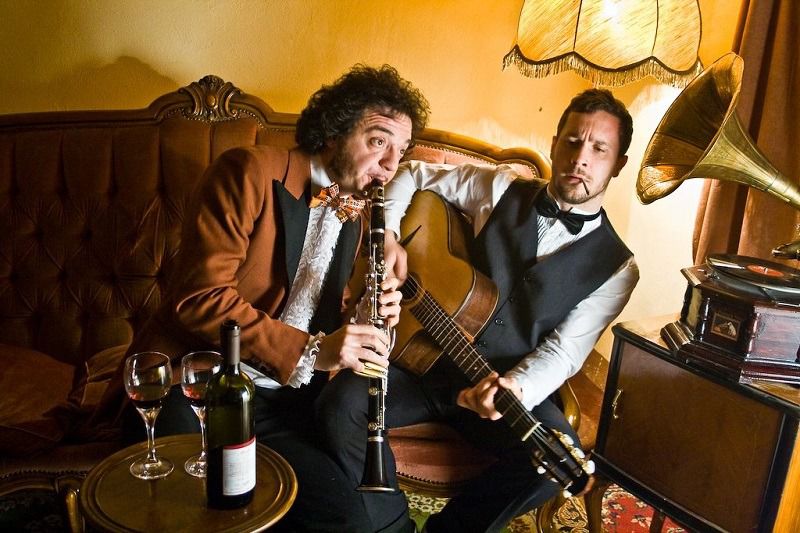 Questi fenomenali attori-musicisti trascinano il pubblico in un viaggio incalzante alla scoperta di personaggi della musica e degli stili musicali più vari: si passa dallo swing europeo alle tradizioni musicali italiane, dalla musica dei Balcani alla tradizione Yiddish. Il tutto attraverso il gioco e una serie di irresistibili gag comiche. Per i ragazzi lo spettacolo si trasforma in un’ora circense e divertentissima in cui prendere dimestichezza con il mondo della musica e con la sua storia. I più grandi invece vivono un’ora di spensieratezza e risate, restando incantati dagli slanci virtuosistici dei due performer.